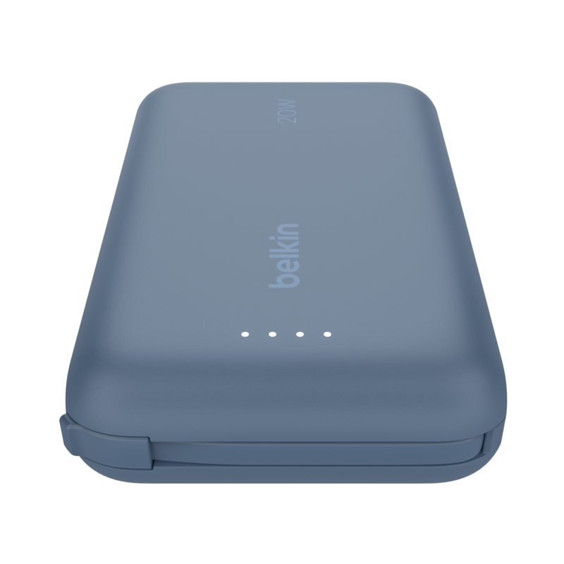 Chargeur portable Belkin BoostCharge - Design fin, compact et léger - Puissance de sortie : 20 W - Capacité de batterie : 10 000 mAh - offre jusqu'à 43 heures de lecture continue - Rechargez deux appareils en même temps - Voyant LED pour indiquer l'état de la batterie externe - Fonction Pass-Through pour recharger un appareil tout en rechargeant la batterie externe - port USB-C - Câble USB-C intégré de 5,7 cm - Dimensions (L x l x H) : 9,9 cm x 6,4 cm x 2,3 cm - Couleur Bleu - Garantie 1 an
