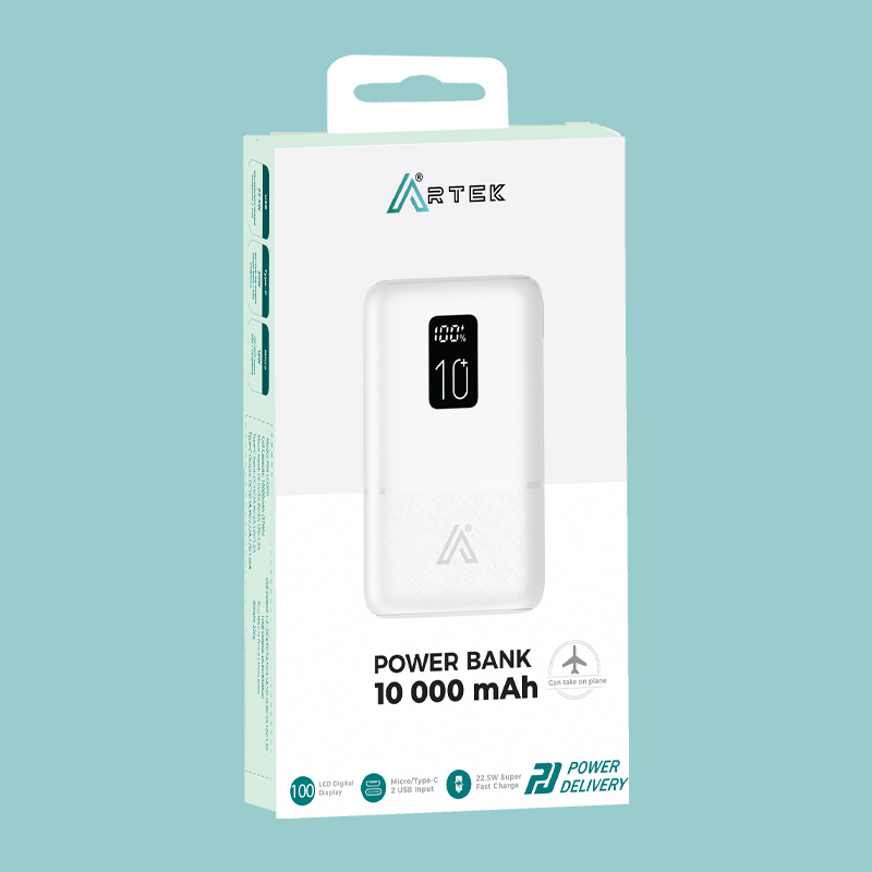 Power Bank ARTEK - Capacité : 10000 mAh - Puissance : 22.5 W (Super Fast Charge) - Entrée : USB-C, Micro USB - Couleur Blanc - Garantie 1 an
