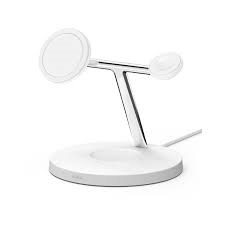 Station de chargement sans fil 3 en 1 avec MagSafe 15 W Belkin WIZ017VFWH - Type de chargeur: Chargeur magnétique, Chargeur sans fil - Puissance: 15 W - Compatibilité: Smartphones / Montres connectées / Écouteurs - Type de connecteur : USB Type C - Tension d’entrée : 5 V - Fonctionne avec le mode En veille de l’iPhone - Couleur Blanc - Garantie 1 an