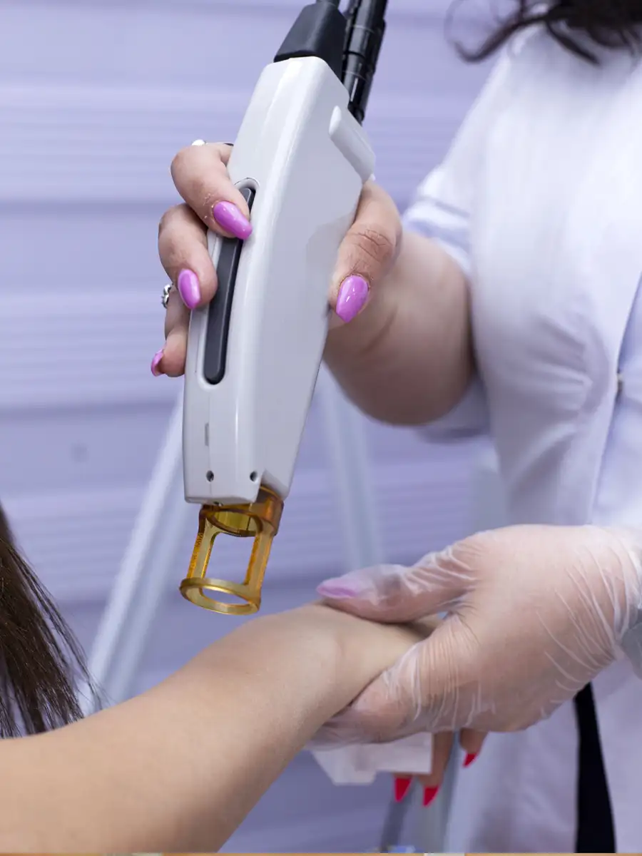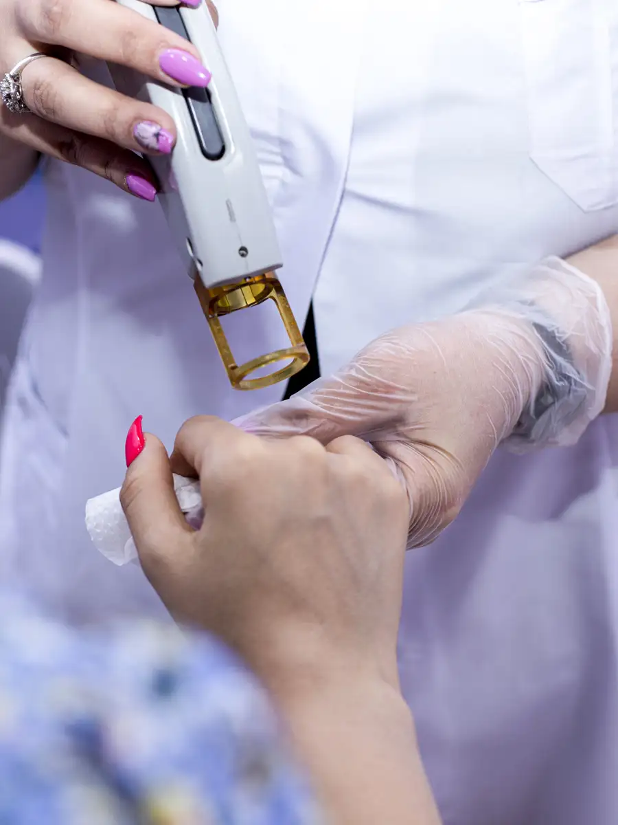 Si vous avez un grain de beauté ou un tatouage, l’assistante protège la peau du rayon laser avec un pansement pour éviter tout risque de brûlure.